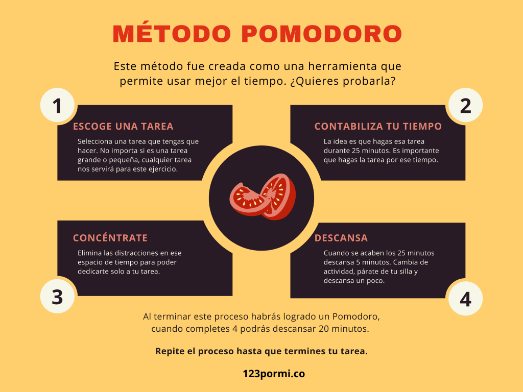 La técnica Pomodoro consiste en usar un temporizador para dividir el trabajo en bloques de tiempo enfocados (generalmente 25 minutos) separados por un breve descanso, generalmente de cinco minutos. Después de cuatro bloques de tiempo de trabajo consecutivos, se toma un descanso más largo, alrededor de 20 o 30 minutos. Cada bloque de trabajo de 25 minutos se llama “pomodoro”. Si sientes la necesidad de hacer algo diferente al trabajo durante un período de concentración, anótalo. Con el tiempo, te entrenarás para ser más productivo durante cada pomodoro.