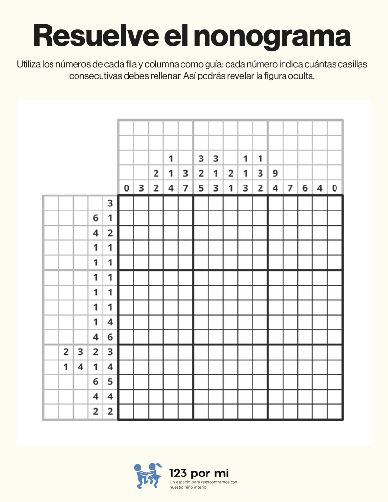 Para resolver este nonograma, utiliza los números de cada fila y columna como guía: cada número indica cuántas casillas consecutivas debes rellenar. Comienza identificando los espacios donde los bloques son seguros (por tamaño o posición), marca esos primero y deja al menos una casilla vacía entre bloques distintos. Luego, cruza la información entre filas y columnas para confirmar o descartar casillas, avanzando poco a poco hasta completar toda la cuadrícula correctamente.