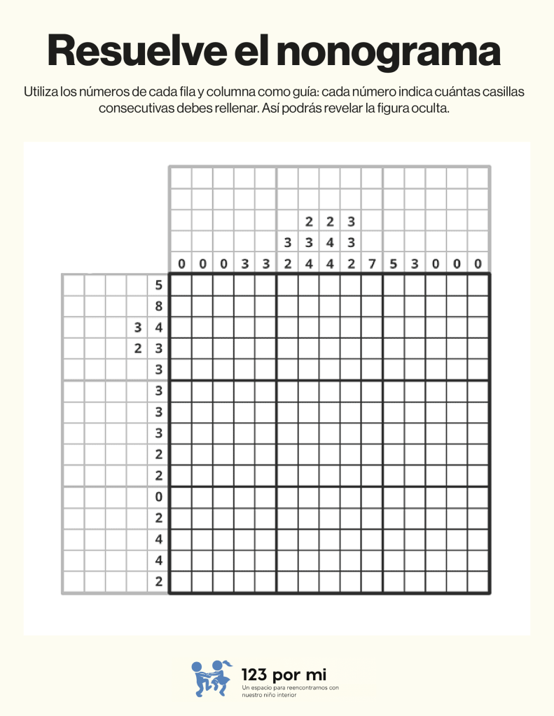 Para resolver este nonograma, utiliza los números de cada fila y columna como guía: cada número indica cuántas casillas consecutivas debes rellenar. Comienza identificando los espacios donde los bloques son seguros (por tamaño o posición), marca esos primero y deja al menos una casilla vacía entre bloques distintos. Luego, cruza la información entre filas y columnas para confirmar o descartar casillas, avanzando poco a poco hasta completar toda la cuadrícula correctamente.