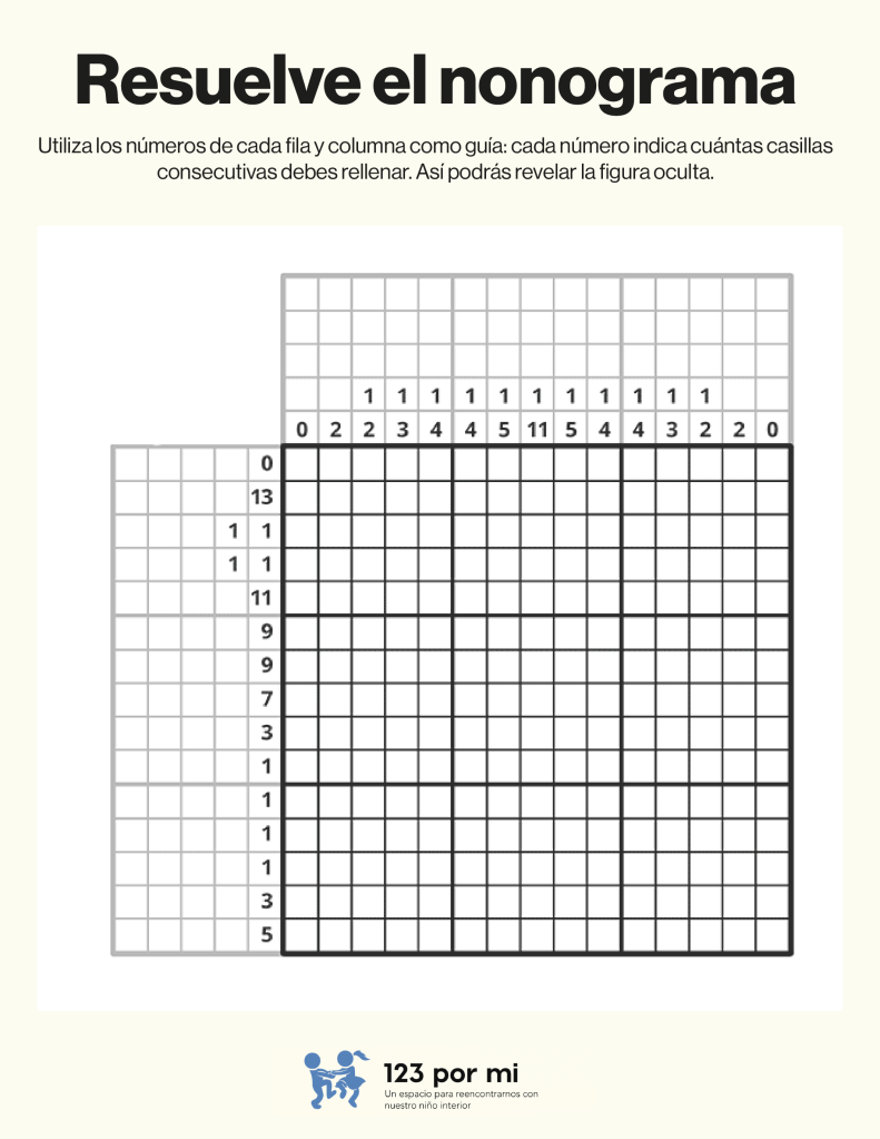 Para resolver este nonograma, utiliza los números de cada fila y columna como guía: cada número indica cuántas casillas consecutivas debes rellenar. Comienza identificando los espacios donde los bloques son seguros (por tamaño o posición), marca esos primero y deja al menos una casilla vacía entre bloques distintos. Luego, cruza la información entre filas y columnas para confirmar o descartar casillas, avanzando poco a poco hasta completar toda la cuadrícula correctamente.