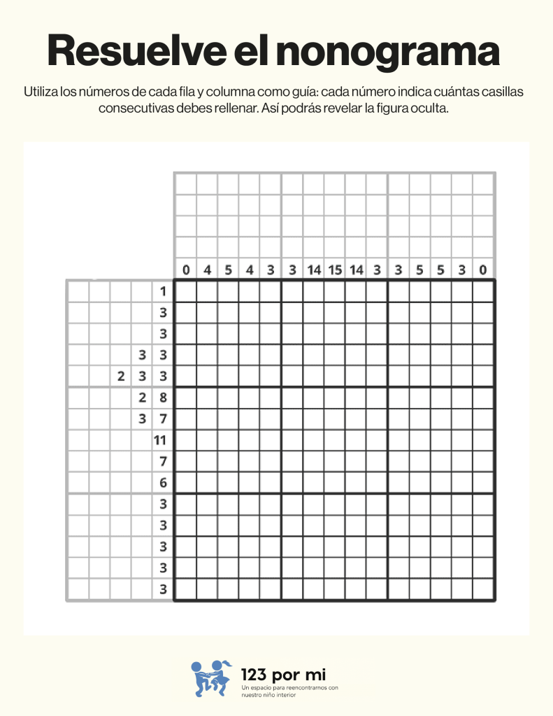 Para resolver este nonograma, utiliza los números de cada fila y columna como guía: cada número indica cuántas casillas consecutivas debes rellenar. Comienza identificando los espacios donde los bloques son seguros (por tamaño o posición), marca esos primero y deja al menos una casilla vacía entre bloques distintos. Luego, cruza la información entre filas y columnas para confirmar o descartar casillas, avanzando poco a poco hasta completar toda la cuadrícula correctamente.