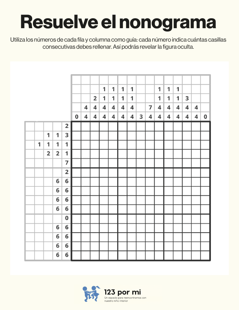 Para resolver este nonograma, utiliza los números de cada fila y columna como guía: cada número indica cuántas casillas consecutivas debes rellenar. Comienza identificando los espacios donde los bloques son seguros (por tamaño o posición), marca esos primero y deja al menos una casilla vacía entre bloques distintos. Luego, cruza la información entre filas y columnas para confirmar o descartar casillas, avanzando poco a poco hasta completar toda la cuadrícula correctamente.