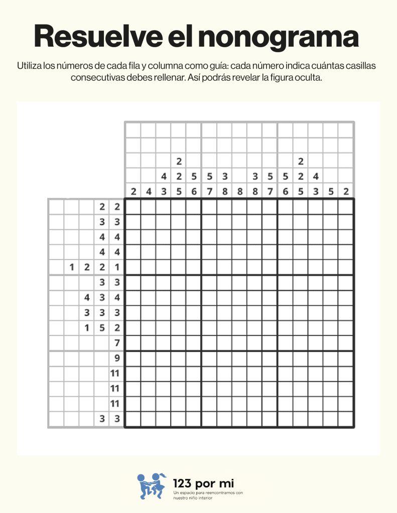 Para resolver este nonograma, utiliza los números de cada fila y columna como guía: cada número indica cuántas casillas consecutivas debes rellenar. Comienza identificando los espacios donde los bloques son seguros (por tamaño o posición), marca esos primero y deja al menos una casilla vacía entre bloques distintos. Luego, cruza la información entre filas y columnas para confirmar o descartar casillas, avanzando poco a poco hasta completar toda la cuadrícula correctamente.