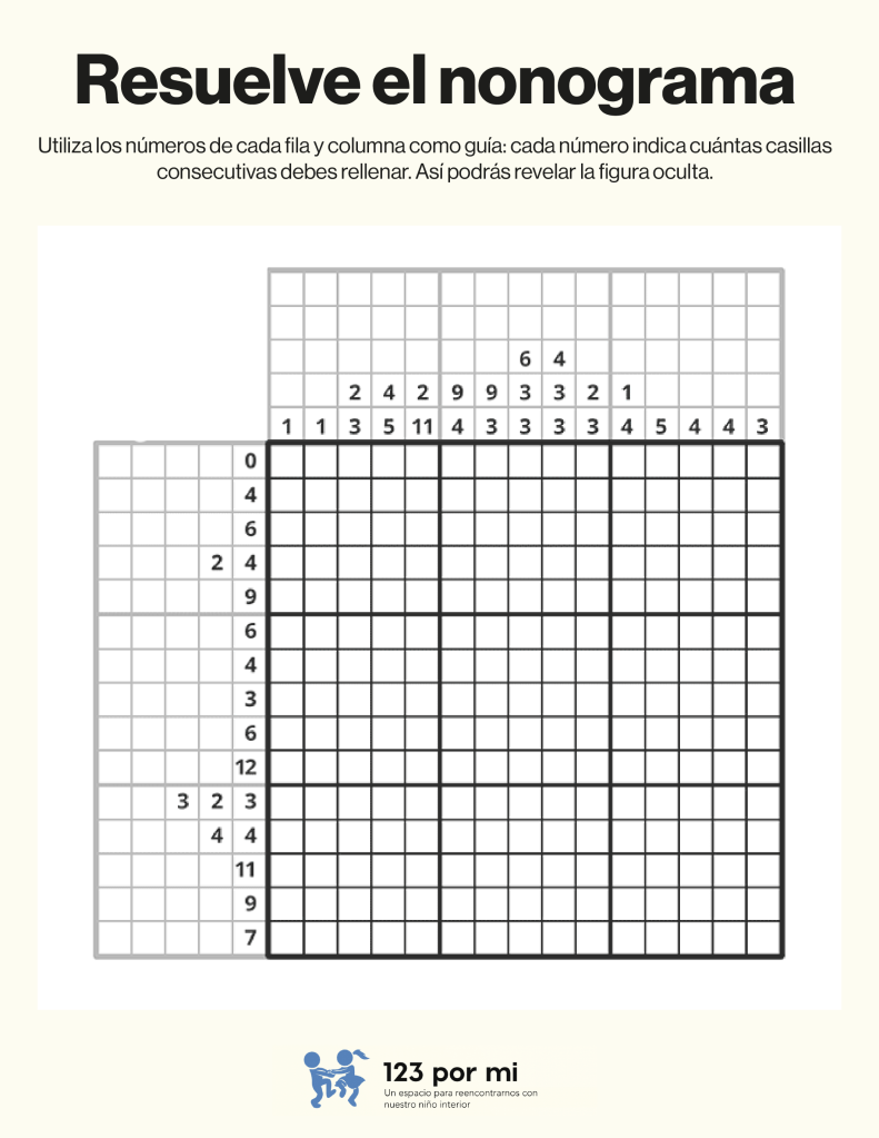 Para resolver este nonograma, utiliza los números de cada fila y columna como guía: cada número indica cuántas casillas consecutivas debes rellenar. Comienza identificando los espacios donde los bloques son seguros (por tamaño o posición), marca esos primero y deja al menos una casilla vacía entre bloques distintos. Luego, cruza la información entre filas y columnas para confirmar o descartar casillas, avanzando poco a poco hasta completar toda la cuadrícula correctamente.